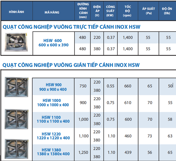 1. Công suất lớn: Với công suất chỉ 0.75 kW, quạt HSW 1100 cung cấp khả năng thông gió mạnh mẽ nhưng vẫn tiết kiệm điện năng.